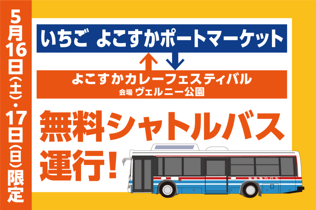 5月の「横須賀朝市×えひめ松山フェア」の開催期間中、いちご よこすかポートマーケットとヴェルニー公園を結ぶ無料シャトルバスを運行します。ヴェルニー公園では同日に「よこすかカレーフェスティバル2026」が開催されます。いちご よこすかポートマーケットとヴェルニー公園を気軽に行き来しながら、横須賀ならではの食やお土産等の魅力を存分に満喫できる2日間をお届けします。